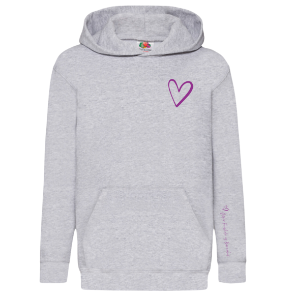 Lækker Fruit of the Loom hættetrøje i børnemodel, med et hjerte på brystet og logo på ærmet. Består af 80% bomuld og 20% polyester. Tryk: Logo er inkluderet i prisen. Tilkøb: Du kan tilkøbe et lille navn foran for 30 kr.